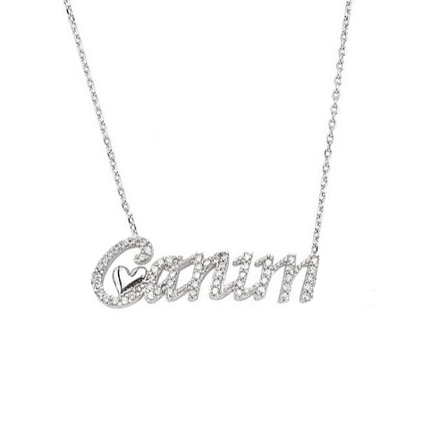 %100 El işçiliği ile ~3,95 gram Gümüş üzerine üretilmiş fotoğraftaki Gümüş Kolye için kullanılan maden rengi Beyaz olarak hazırlanmıştır. Ürünün maden rengi sipariş esnasında vereceğiniz bilgi doğrultusunda sarı, kırmızı ya da beyaz olabilir.Gümüş Kolye firma garantilidir. Zirkon taş bulundurmaktadır. El işçiliği ve yazılacak ismin uzunluğundan kaynaklı ürün gramlarında ufak sapmalar olabilir.